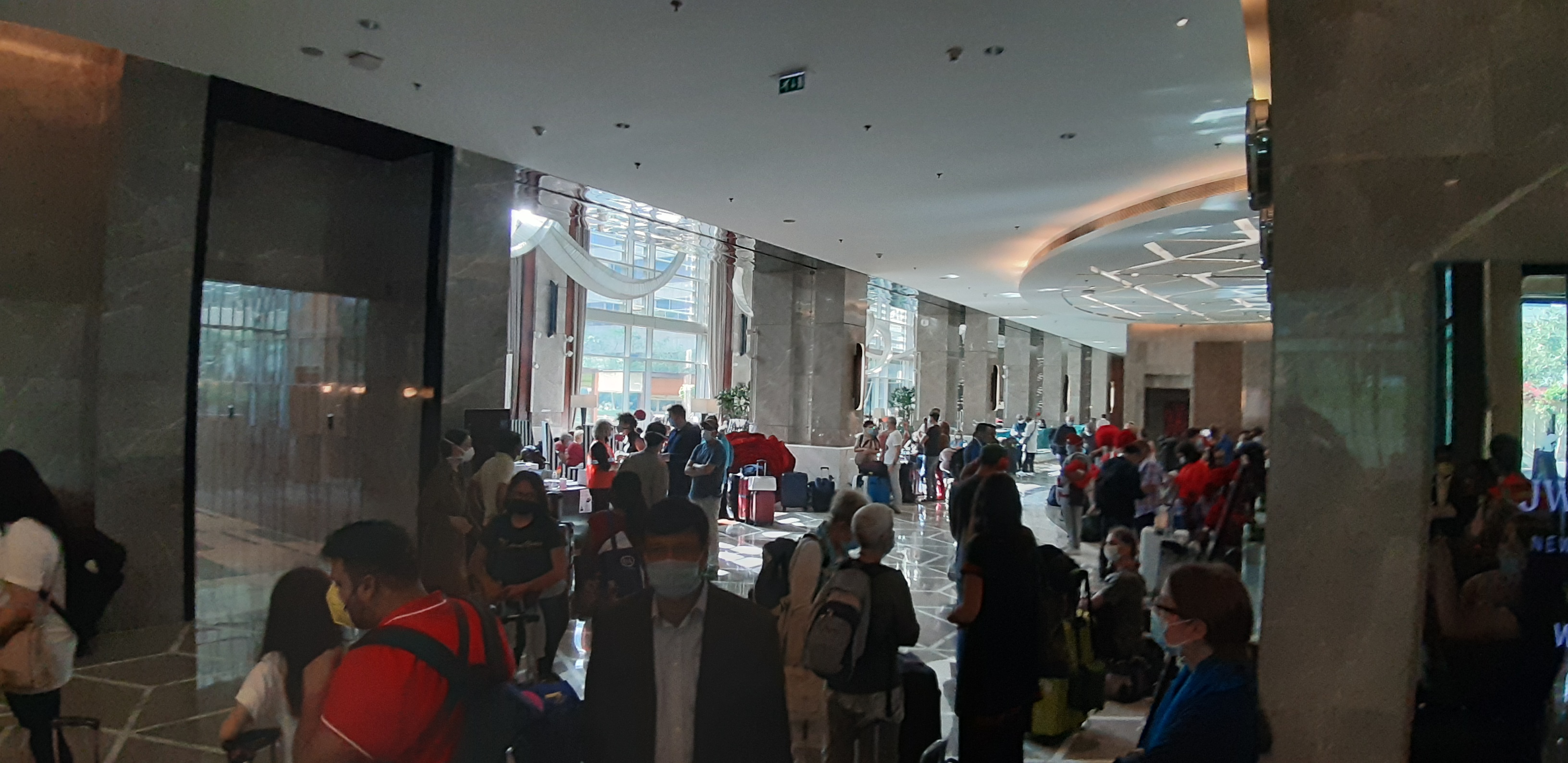 Wir sind nach vier Stunden vom Hotel endlich im Innern der Botschaft. Das Bottleneck ist der Computer hier zum Registrieren. Die Hälfte der Leute steht noch draußen in den Bussen.